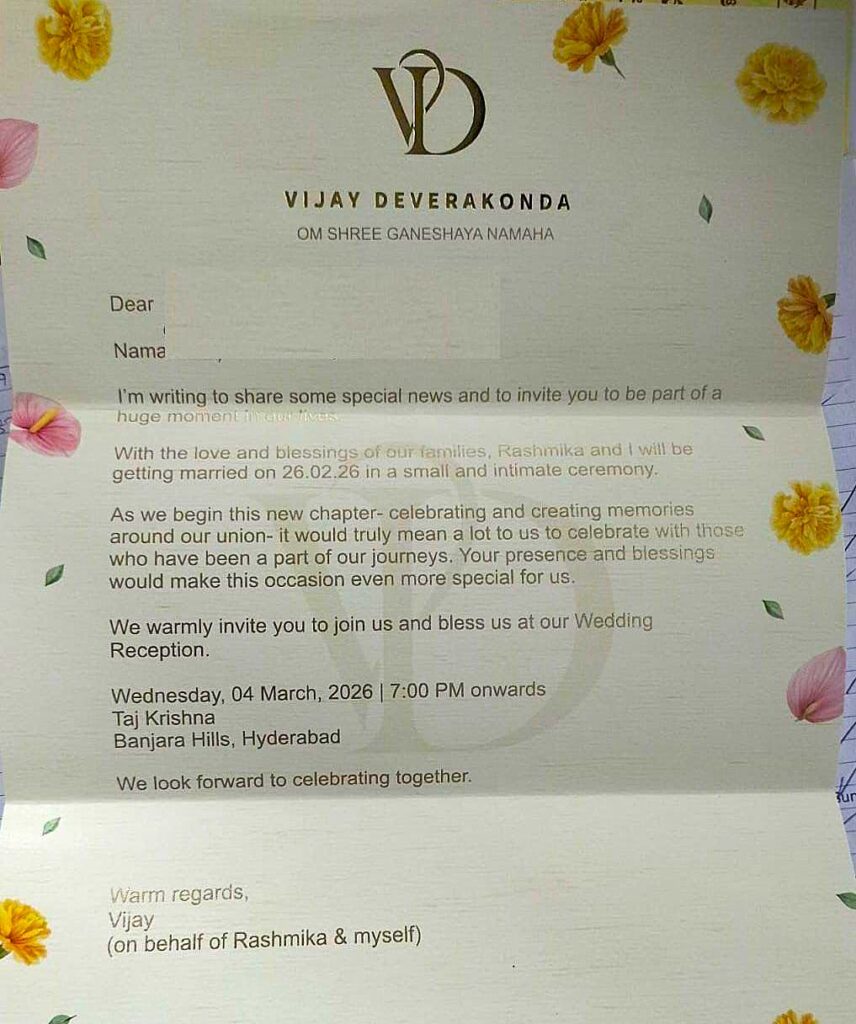 హైదరాబాద్,ఫిబ్రవరి16,2026: టాలీవుడ్లో హాట్ టాపిక్గా మారిన విషయం హీరో విజయ్ దేవరకొండ, నేషనల్ క్రష్ రష్మిక మందన్న వివాహ వార్త. తాజాగా వీరిద్దరి పెళ్లికి సంబంధించిన ఒక ఆసక్తికరమైన ఆహ్వాన పత్రిక సోషల్ మీడియాలో విస్తృతంగా వైరల్ అవుతోంది. ఆ పత్రిక ప్రకారం తమ కుటుంబాల ఆశీస్సులతో విజయ్–రష్మికలు ఫిబ్రవరి 26, 2026న అత్యంత సన్నిహిత బంధుమిత్రుల సమక్షంలో సరళమైన వివాహ వేడుకలో ఒక్కటి కాబోతున్నట్లు పేర్కొన్నారు.