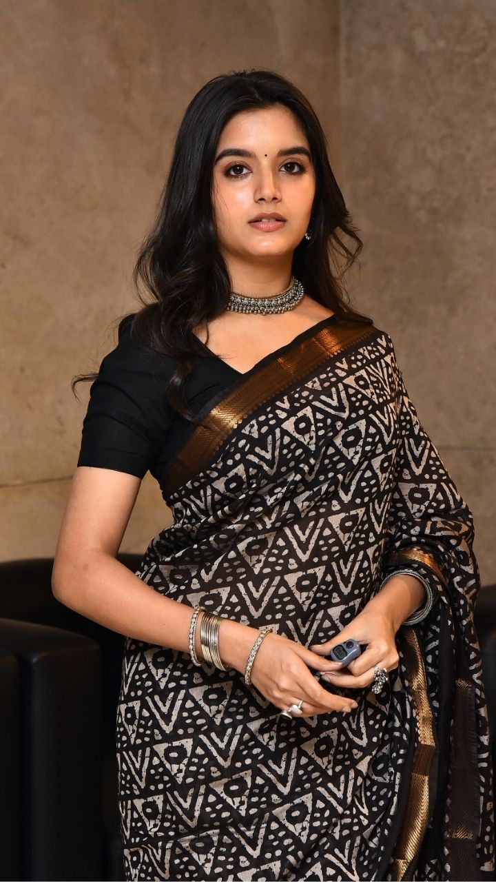 బ్లాక్ ప్రింటెడ్ చీరలో గోల్డెన్ బోర్డర్తో ప్రియాంశి అదిరిపోయేలా మెరిసింది.
