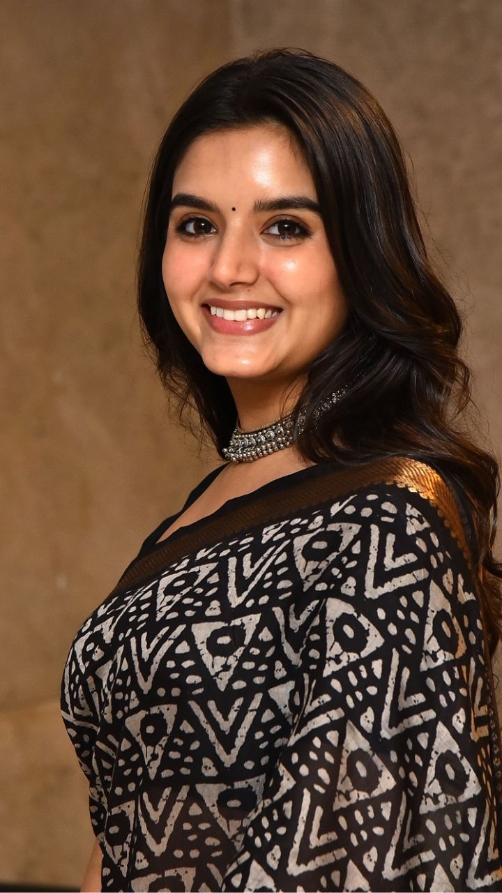 బ్లాక్ ప్రింటెడ్ చీరలో గోల్డెన్ బోర్డర్తో ప్రియాంశి అదిరిపోయేలా మెరిసింది.