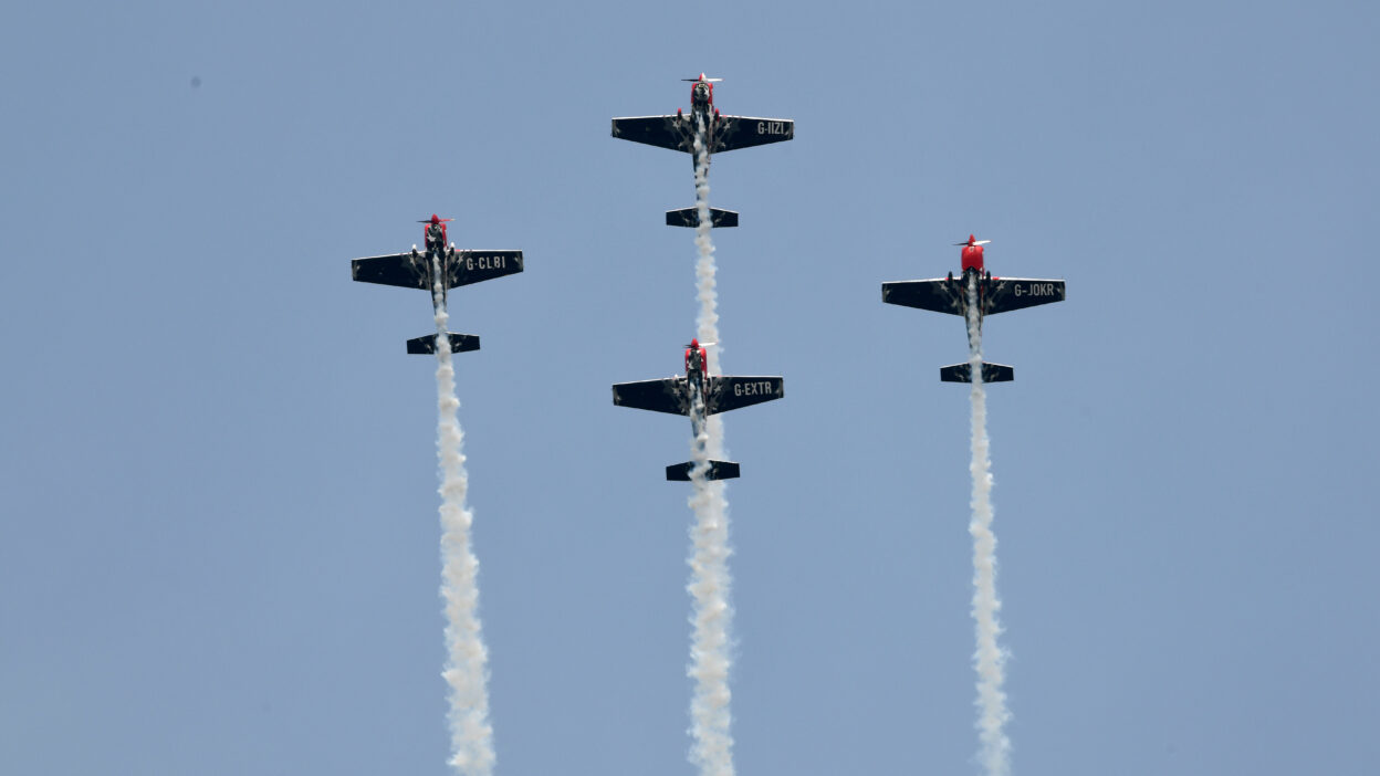 SKAT ప్రదర్శనకు ముందు, అంతర్జాతీయ ఖ్యాతి పొందిన గ్లోబల్ స్టార్స్ ఏరోబాటిక్ టీమ్ కూడా ప్రేక్షకులను అలరించింది. ప్రపంచ ప్రఖ్యాత విమాన పైలట్ Mark Jeffery నేతృత్వంలోని ఈ యూకే ఆధారిత బృందం హై–పర్ఫార్మెన్స్ Extra 330SC విమానాలతో డైమండ్ ఫార్మేషన్, బిగ్ లూప్, ప్యారలల్ రోల్ వంటి విన్యాసాలు ప్రదర్శించింది. డైమండ్ ఫార్మేషన్లో లూప్ చేయడం, ఖచ్చితమైన క్రాసింగ్ విన్యాసాలు ప్రత్యేక ఆకర్షణగా నిలిచాయి. ఆకాశంలో జంట ప్రేమ చిహ్నాలు చిత్రీకరిస్తూ గ్లోబల్ స్టార్స్ టీమ్ తమ ప్రదర్శనకు ముగింపు పలికింది.