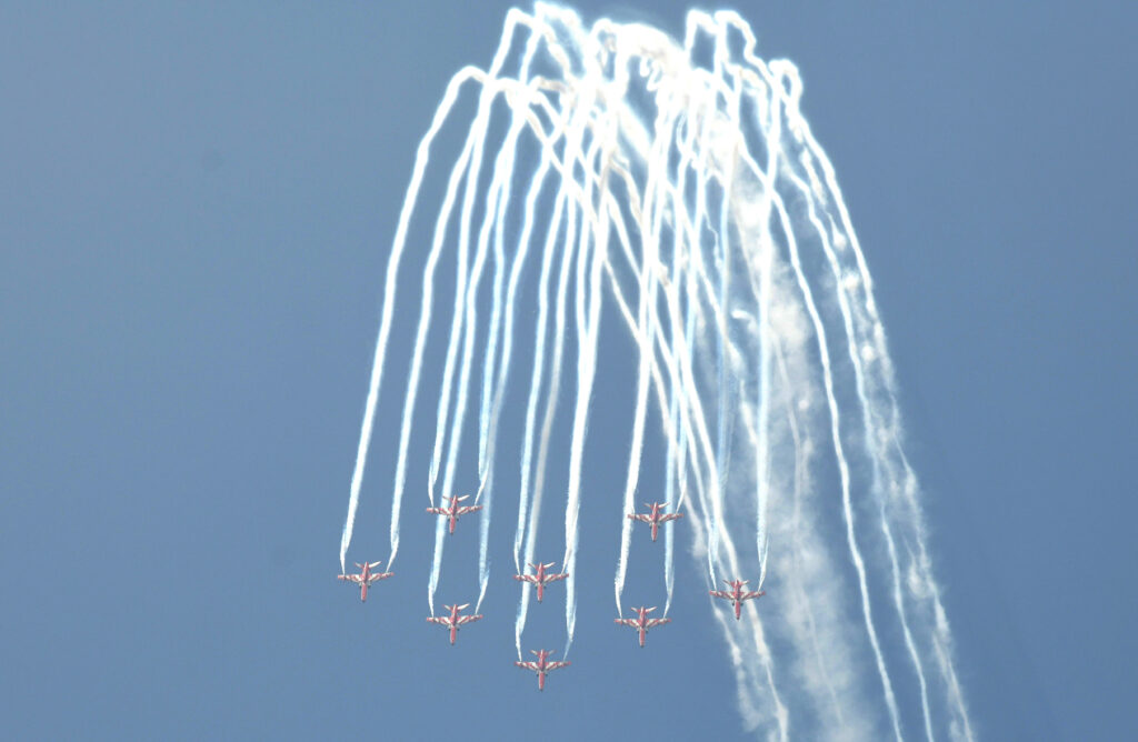 కర్ణాటకలోని బీదర్ ఎయిర్ ఫోర్స్ స్టేషన్ నుంచి బయలుదేరిన తొమ్మిది హాక్ ఎంకే–132 విమానాలు జాతీయ త్రివర్ణ ఆకారంలో రంగుల పొగతో ఆకాశంలో ప్రత్యక్షమయ్యాయి. గ్రూప్ కెప్టెన్ అజయ్ దాసరథి నాయకత్వంలో SKAT పటిష్టమైన సమన్వయం, కచ్చితమైన సమయం, ఖచ్చితమైన దూరం పాటిస్తూ విన్యాసాలు ప్రదర్శించింది.